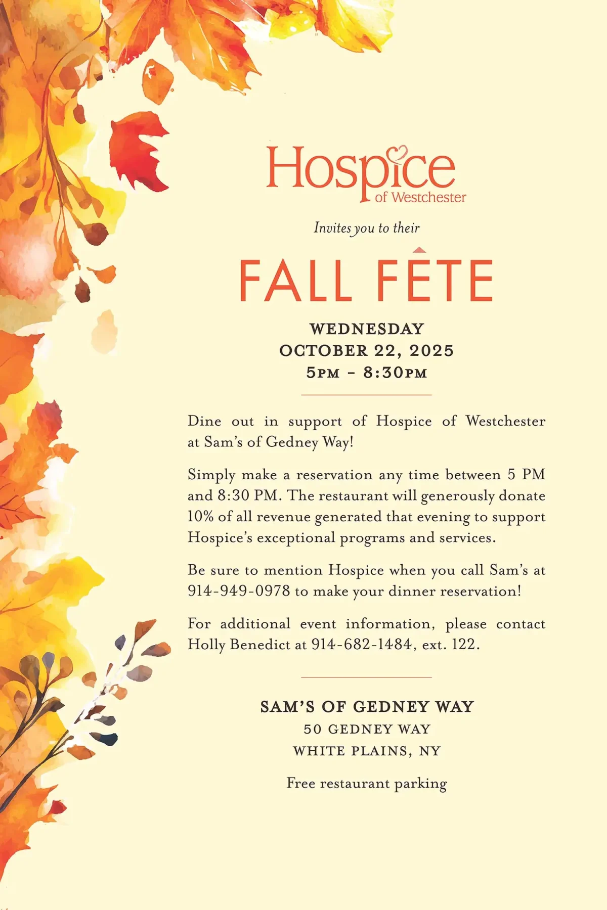 The Hospice of Westchester Fall Fête is scheduled for Wednesday, October 22, 2025, and reservations can be made anytime between 5:00 PM and 8:30 PM at Sam’s of Gedney Way.